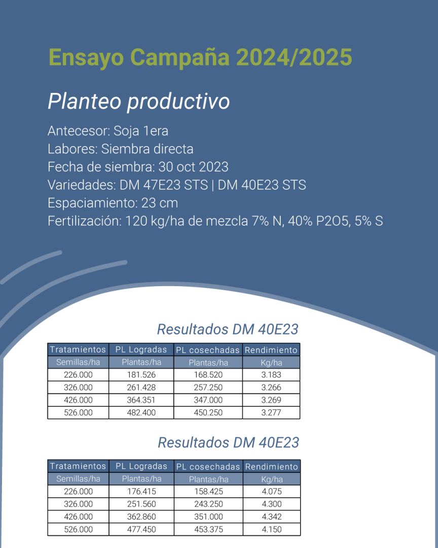 En un experimento realizado durante la campañas 2023/2024 y 2024/2025, se demostró que un incremento por encima del 100% (de 226 mil a 526 mil semillas por hectáreas), los el rendimiento de kilogramos por hectárea no tuvo variaciones significativas. De este modo, los productores podrían adecuar la estrategia de manejo, particularmente la densidad de siembra, de acuerdo a los condicionamientos del lote, manteniendo los resultados esperados.